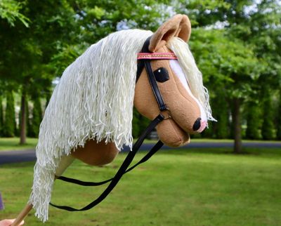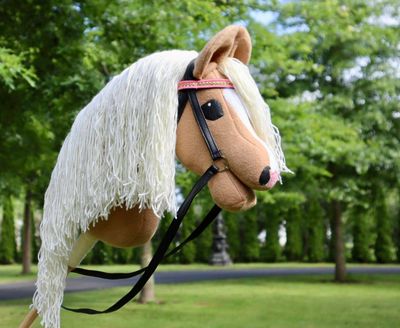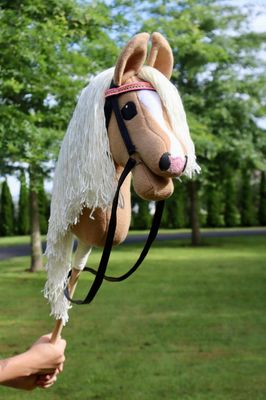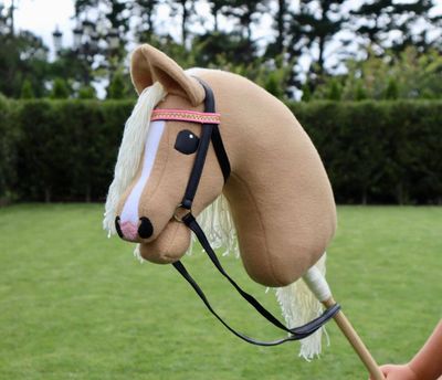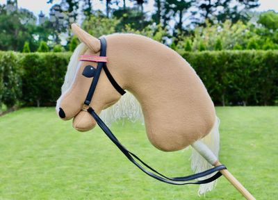 Stunning hobby horse with a white snip, pink nose and long cream mane.